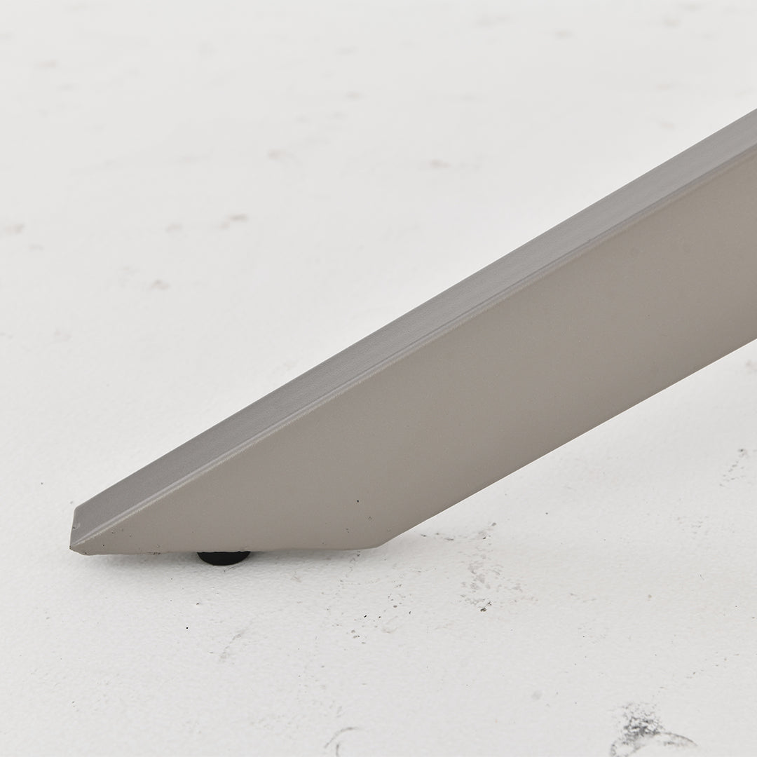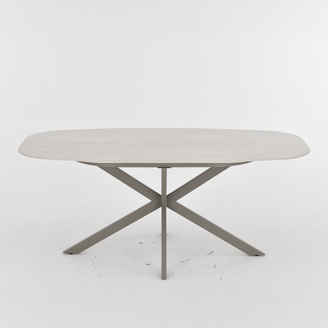 De Eettafel Santiago Deens Ovaal 180 cm is een moderne en stijlvolle tafel die perfect past in een eigentijds interieur. Het blad van melamine heeft een elegante zilvergrijze kleur en een Deens ovale vorm, wat zorgt voor een verfijnde en luchtige uitstraling. De matrixpoot van metaal in zilvergrijs geeft de tafel een stevige basis en een strak, industrieel accent.