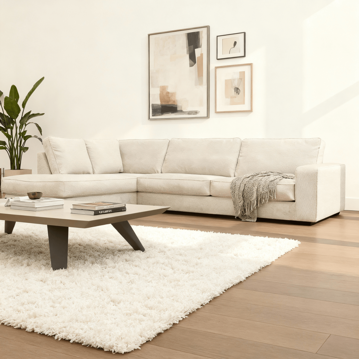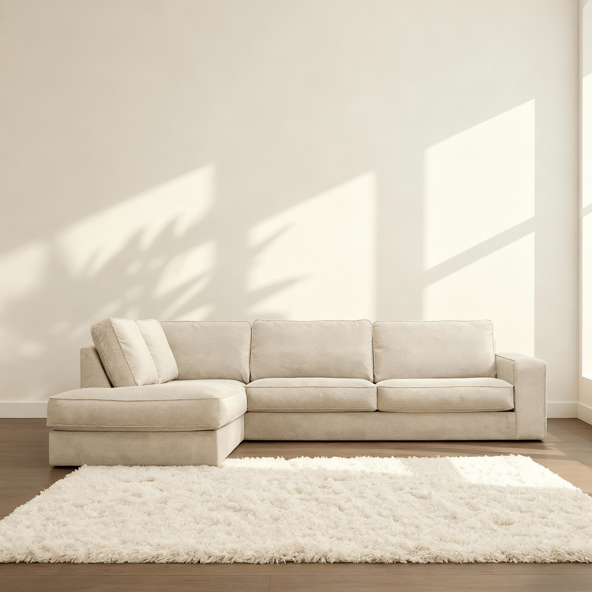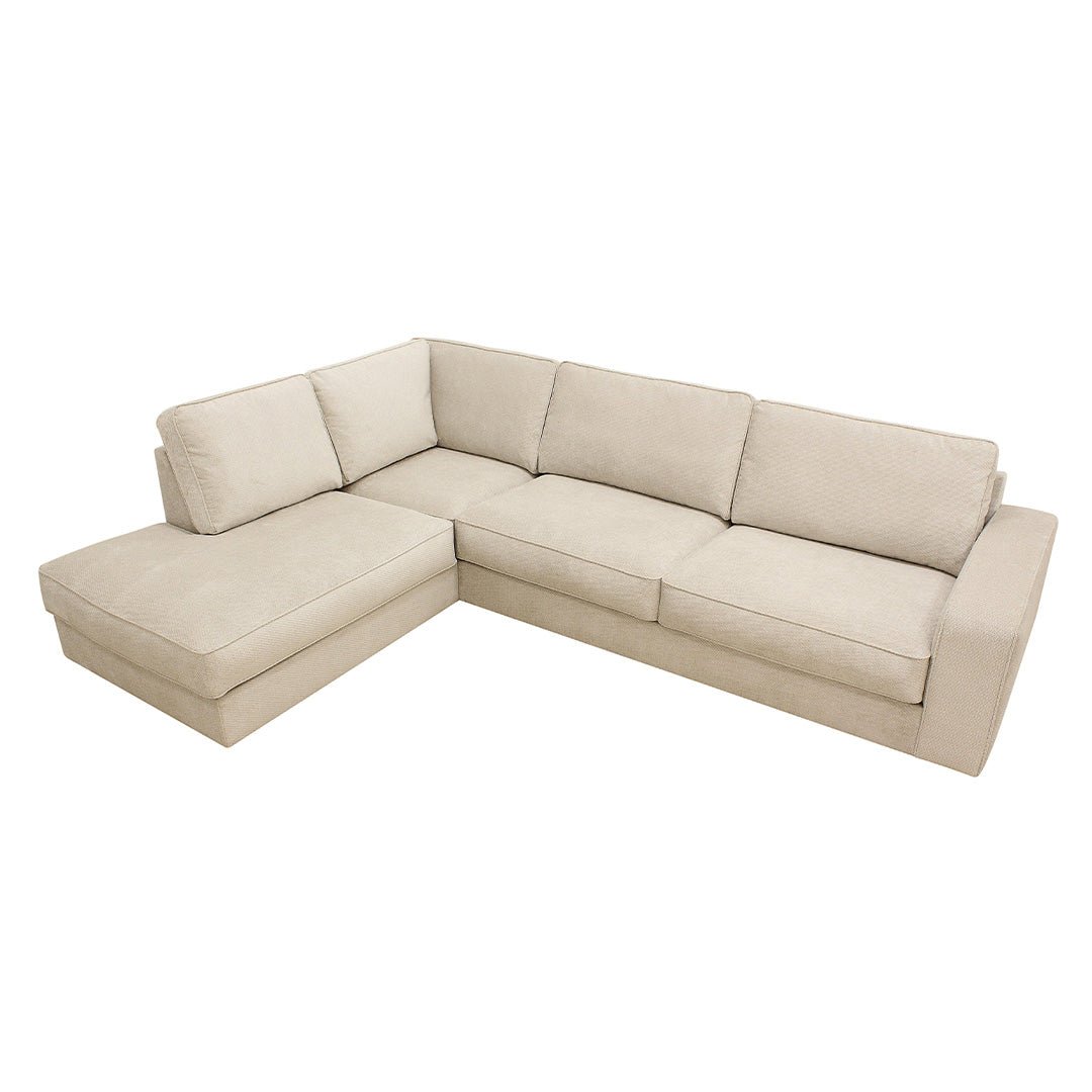 Hoekbank Colton 4-zits Links Crème is een ruime en comfortabele bank die perfect past in een modern interieur. De bank is bekleed met zachte Vinci-stof in een crèmekleur, wat zorgt voor een rustige en tijdloze uitstraling.