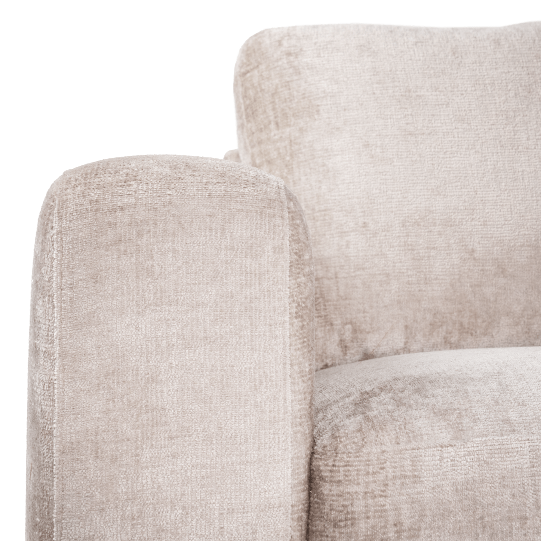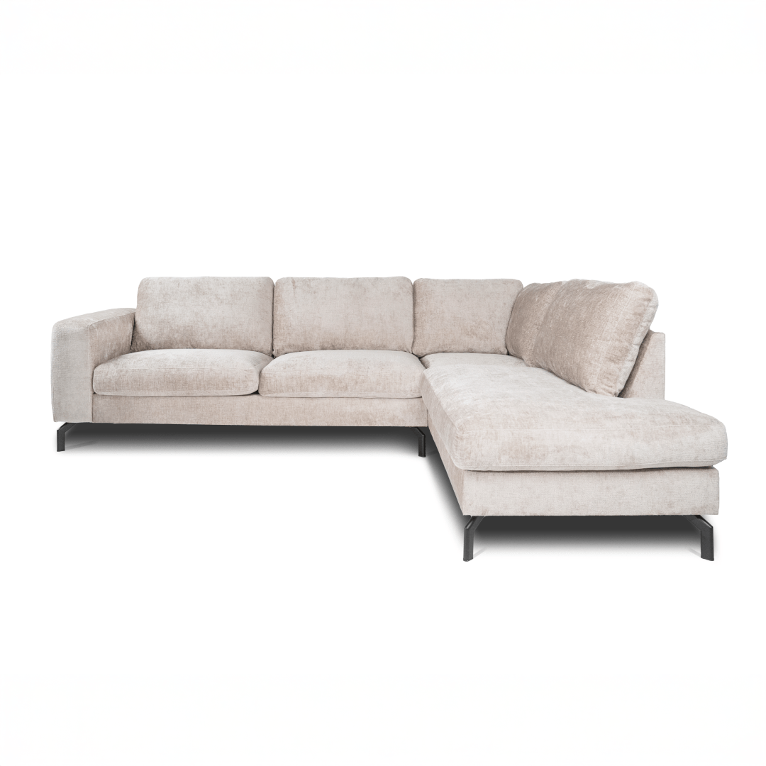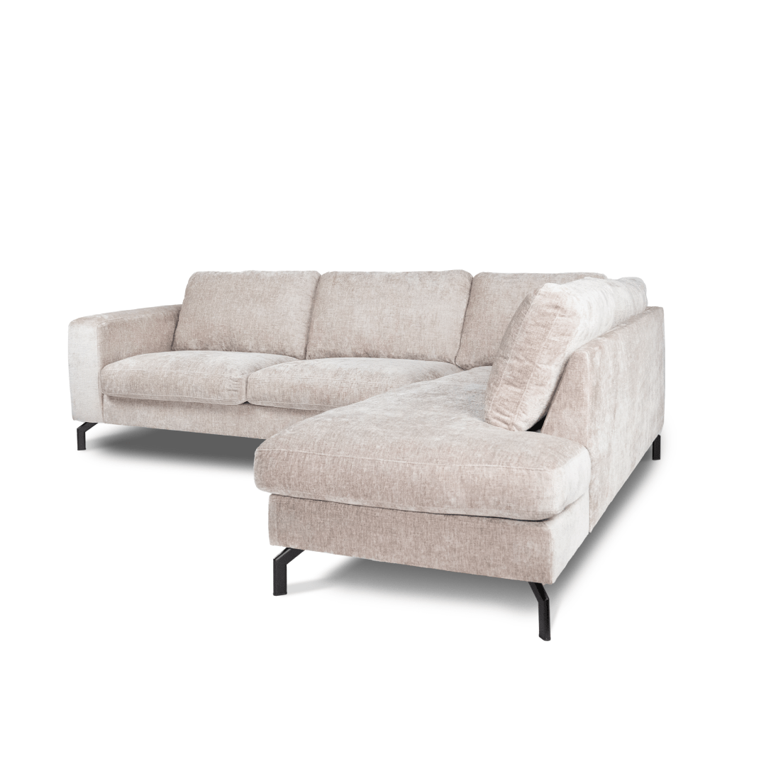 De 4-zits hoekbank Rosalie rechts in champagne is een stijlvolle en comfortabele toevoeging aan je woonkamer. De zachte champagne kleurige bekleding straalt rust en elegantie uit, waardoor de bank moeiteloos past binnen diverse interieurstijlen, van modern tot klassiek.