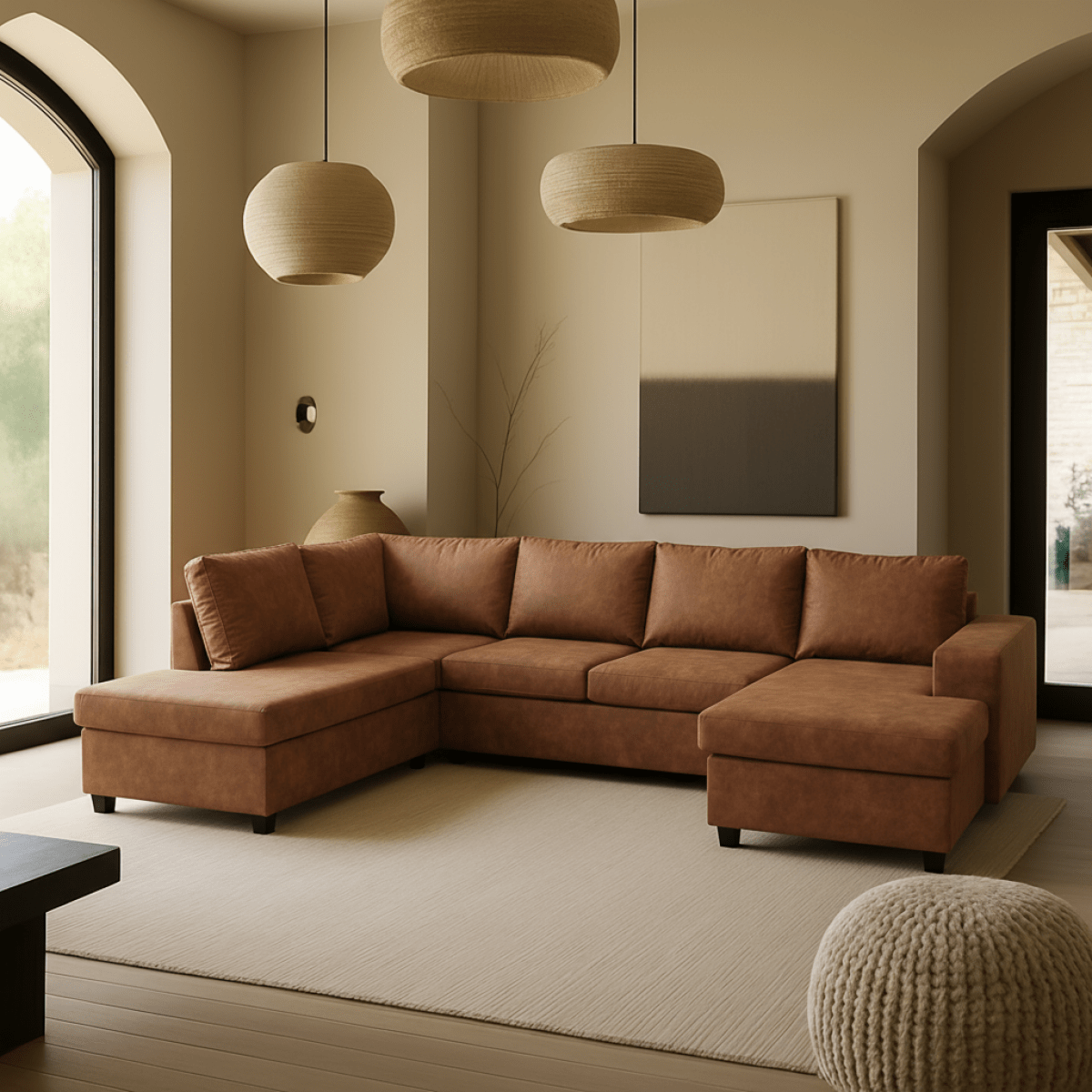 Hoekbank Santiago 4-zits U-opstelling Links Cognac brengt sfeer en comfort in je woonkamer. De bank is uitgevoerd in Preston-stof in een warme cognac kleur, wat zorgt voor een stijlvolle en uitnodigende uitstraling.