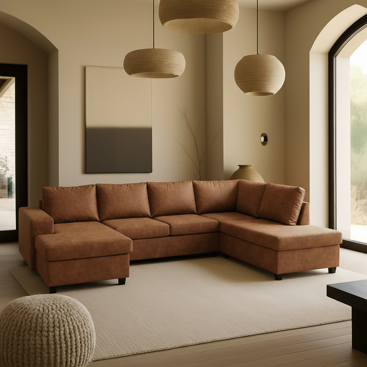 Hoekbank Santiago 4-zits U-opstelling Rechts Cognac is een echte blikvanger in je woonkamer. De bank is bekleed met Preston-stof in een warme cognac kleur, wat zorgt voor een stoere en sfeervolle uitstraling.