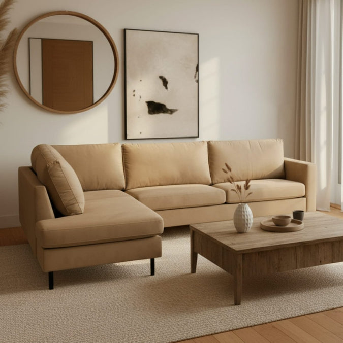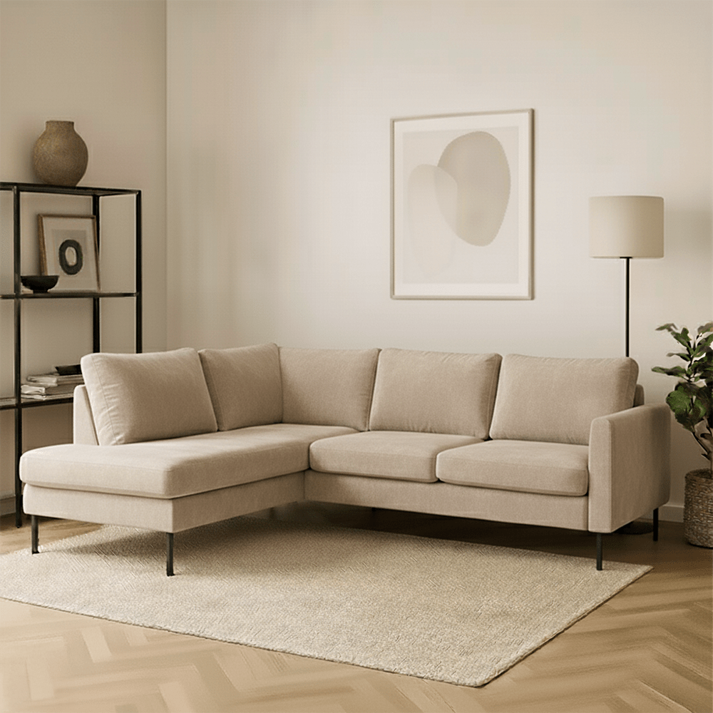 Breng warmte en elegantie in je interieur met hoekbank Sterre. Deze moderne L-vormige bank straalt klasse uit en biedt royaal comfort voor het hele gezin. Dankzij de zachte velours bekleding en het strakke design is Sterre dé eyecatcher in elke woonkamer.
