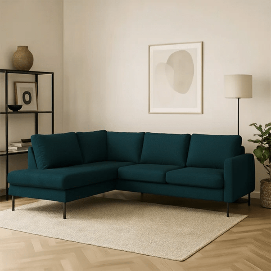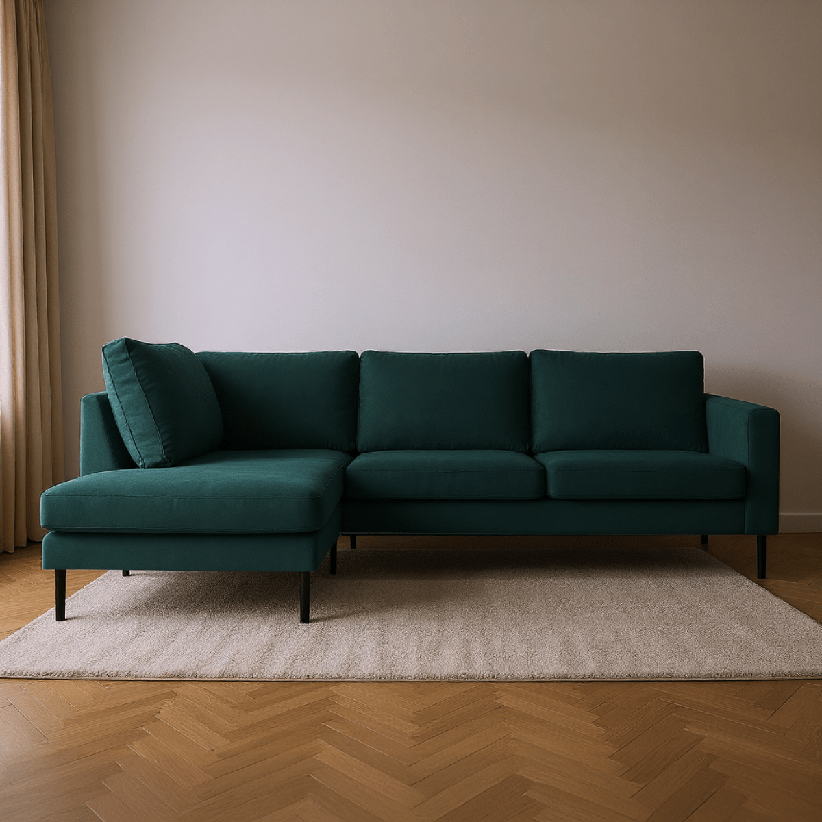 Breng warmte en elegantie in je interieur met hoekbank Sterre. Deze moderne L-vormige bank straalt klasse uit en biedt royaal comfort voor het hele gezin. Dankzij de zachte velours bekleding en het strakke design is Sterre dé eyecatcher in elke woonkamer.