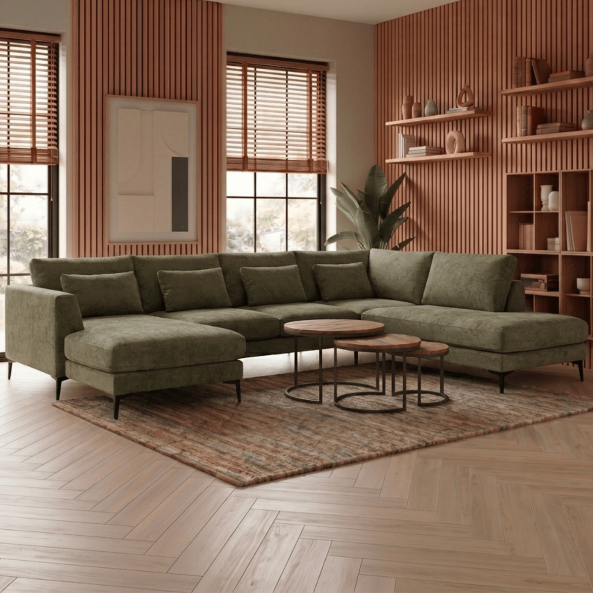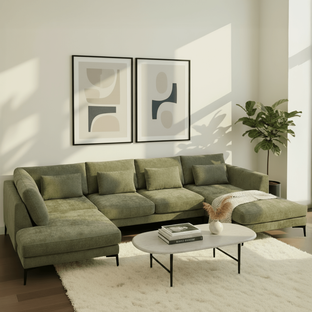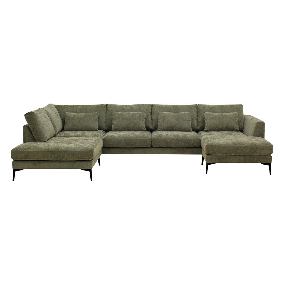 Hoekbank Willow 5-zits U-opstelling Links Groen is een ruime en stijlvolle bank die je woonkamer een moderne uitstraling geeft. De bank is bekleed met zachte Holms-stof in een frisse groene kleur, wat zorgt voor een warme en eigentijdse sfeer.