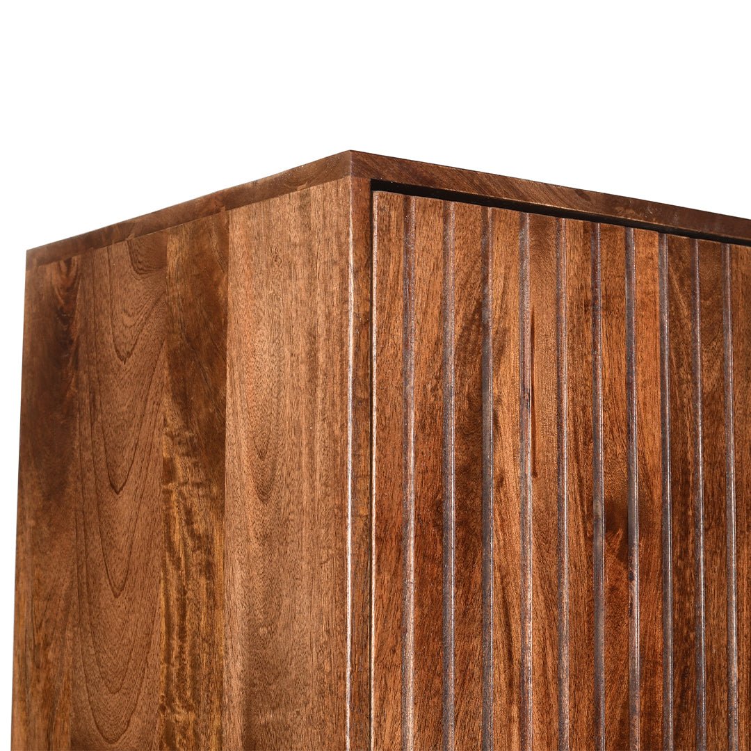 De kast is gemaakt van mangohout waarbij de natuurlijke houtstructuur goed zichtbaar blijft. Dit geeft het meubel een warme en serene basis die perfect aansluit bij een Japandi woonstijl.