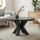Het massieve mangohout is eerst gezandstraald, vervolgens behandeld met zwarte verfbeits en tenslotte afgewerkt met een donkere, natuurlijke bijenwas om het hout te beschermen tegen vocht, vuil en kringen. De metalen frames en handgrepen zijn behandeld met een zwarte poedercoating.