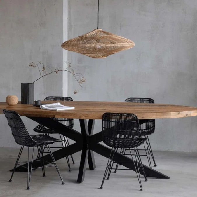 Onze kleinste eettafel uit onze Tulsa-collectie en hij is echt ideaal om met een intiem gezelschap aan te dineren. De ovale vorm neemt minder ruimte in dan een rechthoekige tafel en de warme combinatie van het mangohout met de metalen poten passen perfect in uw eetkamer.